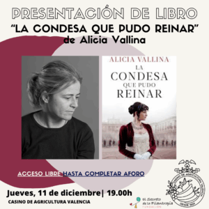 PRESENTACIÓN LIBRO “La condesa que pudo reinar” de Alicia Vallina Alicia Vallina presenta su novela La condesa que pudo reinar, basada en la vida de la condesa de Echauz y […] 11 Dic 19:00 - 20:45 Casino de agricultura Valencia, España