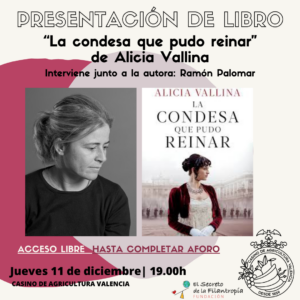 PRESENTACIÓN LIBRO “La condesa que pudo reinar” de Alicia Vallina Alicia Vallina se ha fijado para componer su nueva novela, en Pilar de Azedo, condesa de Echauz, una mujer ilustrada […] 11 Dic 19:00 - 20:45 Casino de agricultura Valencia, España