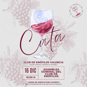 CLUB DE ENÓFILOS | Asamblea General Anual El próximo martes día 16, a las 19:00 horas, celebraremos en el Casino de Agricultura de Valencia la Asamblea General […] 16 Dic 19:00 - 21:00 Casino de agricultura Valencia, España
