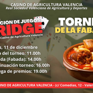 TORNEO DE LA FABADA | Sección juegos – Bridge ¡Llega al Casino de Agricultura Valencia el esperado Torneo de la Fabada! La Sección de Juegos Bridge organiza una jornada […] 11 Dic 11:00 - 18:00 Casino de agricultura Valencia, España