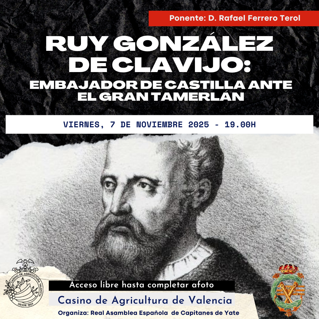 La conferencia Ruy González de Clavijo: embajador de Castilla ante el Gran Tamerlán nos acerca a la extraordinaria aventura diplomática emprendida a comienzos del siglo XV. Clavijo fue enviado por Enrique III de Castilla a Samarcanda, en una misión que lo llevó a recorrer miles de kilómetros y entrar en contacto con una de las figuras más poderosas de su tiempo. La charla abordará el valor histórico de su viaje y el testimonio escrito que dejó, un documento excepcional sobre el encuentro entre dos mundos.