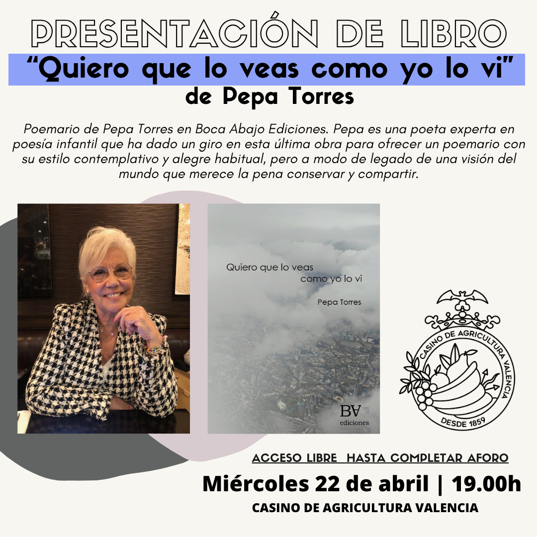 “Quiero que lo veas como yo lo vi” es el quinto poemario de Pepa Torres en Boca Abajo Ediciones. Pepa es una poeta experta en poesía infantil que ha dado un giro en esta última obra para ofrecer un poemario con su estilo contemplativo y alegre habitual, pero a modo de legado de una visión del mundo que merece la pena conservar y compartir. Ver el mundo como lo ve Pepa Torres es una suerte.