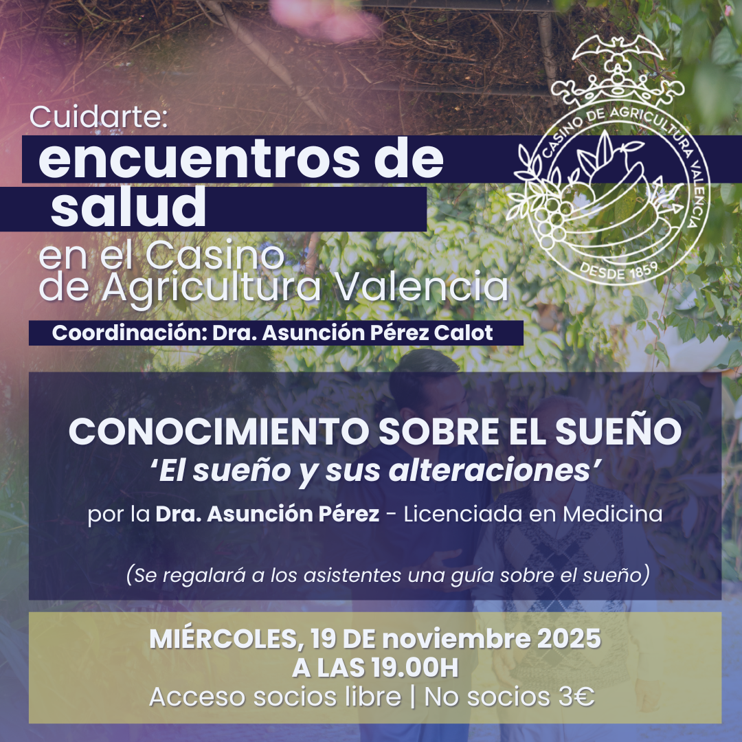 El Casino de Agricultura de Valencia te invita a una nueva sesión del ciclo “Cuidarte: encuentros de salud”, coordinado por la Dra. Asunción Pérez Calot. En esta ocasión, profundizaremos en un tema fundamental para el bienestar: el sueño.